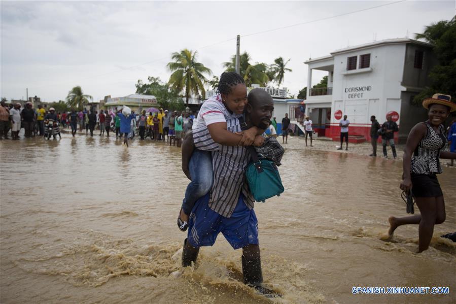 Un hombre llevaba a una mujer a las espaldas caminando en una calle inundada en Haití el 5 de octubre. Haití, Cuba y Bahama, entre otros países de Caribe fueron azotados por el huracán "Matthew", el más poderoso en los últimos diez a?os en esta zona. (Xinhua/AP)
