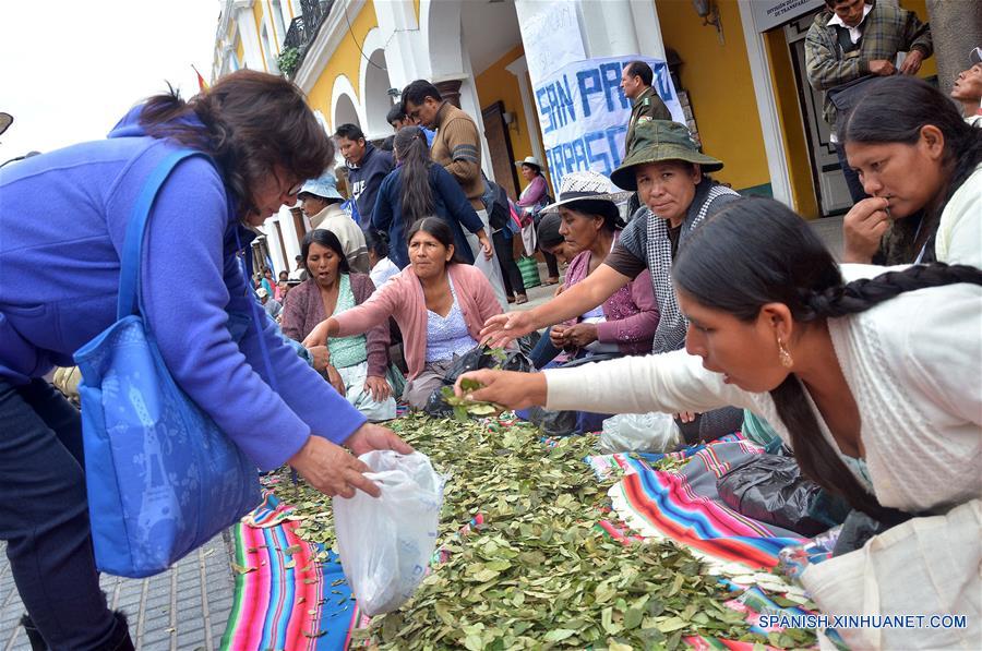 Personas participan durante un festejo en el marco del Día Nacional del Acullico, en Cochabamba, Bolivia, el 11 de enero de 2017. Bolivia conmemora el miércoles el Día Nacional del Acullico (masticación de la hoja de coca) con una serie de actividades, con el fin de mostrar al mundo las bondades de la planta y sus derivados. Según el ministro boliviano de Desarrollo Rural y Tierras, César Cocarico, el 11 de enero se conmemora el Día Nacional del Acullico, debido a que en esa fecha de 2013 Bolivia se adhirió a la "Convención única de las Naciones Unidas sobre Estupefacientes de 1961, emanada del Protocolo de 1972", con la reserva de permitir la masticación tradicional de la hoja de coca en todo el territorio nacional. El acullico es la masticación de la hoja de coca y es un modo de consumo particular ancestral y tradicional, como símbolo de diálogo, reciprocidad y equilibrio con la naturaleza, la masticación tradicional es conocida en los valles como "boleo" y en el este como "pijcheo". (Xinhua/Patricio Pinto/ABI)