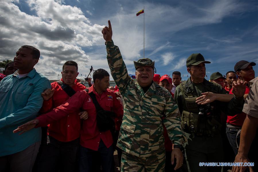 El primer vicepresidente del Partido Socialista Unido de Venezuela, Diosdado Cabello (c), participa en el Ejercicio de Acción Integral Antiimperialista Zamora 200, en Caracas, capital de Venezuela, el 14 de enero de 2017. Este fin de semana se lleva a cabo el Ejercicio de Acción Integral Antiimperialista Zamora 200, en el que participarán más de 100,000 hombres y mujeres de los cuatro componentes de la Fuerza Armada Nacional Bolivariana (FANB) del país, informó el segundo comandante del Comando Estratégico Operacional (CEO), de la FANB, Remigio Ceballos, explicando que esta acción cívico-militar tiene su proceso de planificación desde el 28 de diciembre de 2016, por instrucciones del presidente venezolano, Nicolás Maduro, y su objetivo estratégico es preparar al pueblo en la defensa integral del país, de acuerdo con información de la prensa local. (Xinhua/Str)