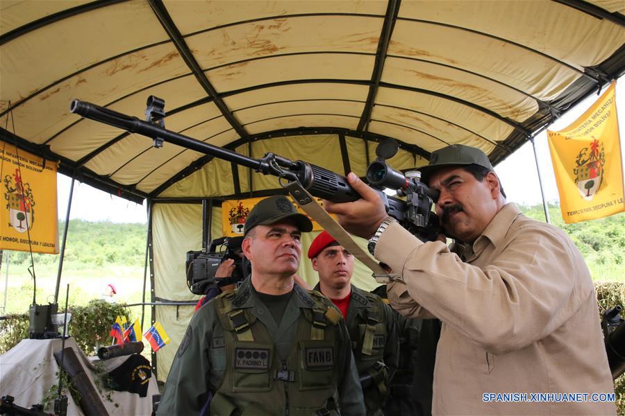 Imagen cedida por la Presidencia de Venezuela del presidente venezolano, Nicolás Maduro (d), asistiendo al Ejercicio de Acción Integral Antiimperialista Zamora 200, en las instalaciones del Fuerte Guaicaipuro, en el estado Miranda, Venezuela, el 14 de enero de 2017. Este fin de semana se lleva a cabo el Ejercicio de Acción Integral Antiimperialista Zamora 200, en el que participarán más de 100,000 hombres y mujeres de los cuatro componentes de la Fuerza Armada Nacional Bolivariana (FANB) del país, informó el segundo comandante del Comando Estratégico Operacional (CEO), de la FANB, Remigio Ceballos, explicando que esta acción cívico-militar tiene su proceso de planificación desde el 28 de diciembre de 2016, por instrucciones del presidente venezolano, Nicolás Maduro, y su objetivo estratégico es preparar al pueblo en la defensa integral del país, de acuerdo con información de la prensa local. (Xinhua/Presidencia de Venezuela)