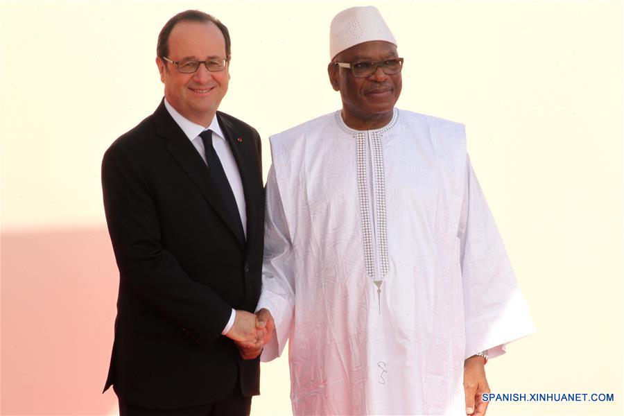 El presidente de Francia, Francois Hollande (i), estrecha la mano con el presidente de Mali, Ibrahim Boubacar Keita (d), previo a la ceremonia de inauguración de la XXVII Cumbre Africa-Francia, en Bamako, Mali, el 14 de enero de 2017. Líderes africanos y franceses comenzaron una cumbre el sábado en Bamako sobre máxima seguridad, enfocándose en temas clave incluyendo la paz y la seguridad, el clima y la economía. (Xinhua/Diop)