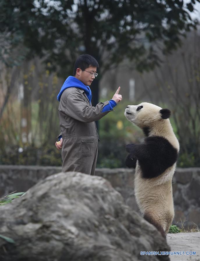 El cuidador Zou Wenyong da entrenamiento de miembros posteriores a un panda gigante en la base de Dujiangyan del Centro de Conservación e Investigación para el Panda Gigante de China, en la provincia de Sichuan, en el suroeste de China, el 27 de enero de 2017. Los empleados siguen trabajando en el centro para cuidar de los pandas gigantes durante las vacaciones del Festival de Primavera. (Xinhua/Xue Yubin)