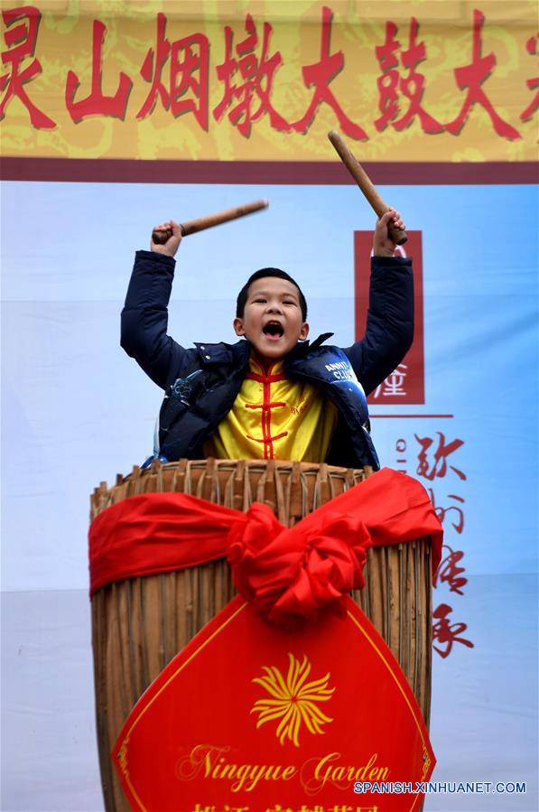 Un ni?o toca un tambor durante un concurso del tambor llevado a cabo para celebrar el Festival de Primavera, en Qinzhou, en la Región Autónoma Zhuang de Guangxi, en el sur de China, el 2 de febrero de 2017. (Xinhua/Zhang Ailin)