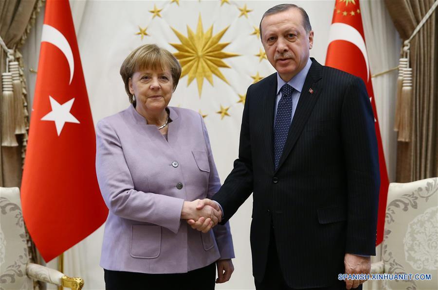 El presidente de Turquía, Recep Tayyip Erdogan (d), estrecha la mano con la canciller alemana, Angela Merkel (i), durante su reunión en el Palacio Presidencial, en Ankara, Turquía, el 2 de febrero de 2017. (Xinhua/Depo Photos/ZUMAPRESS)