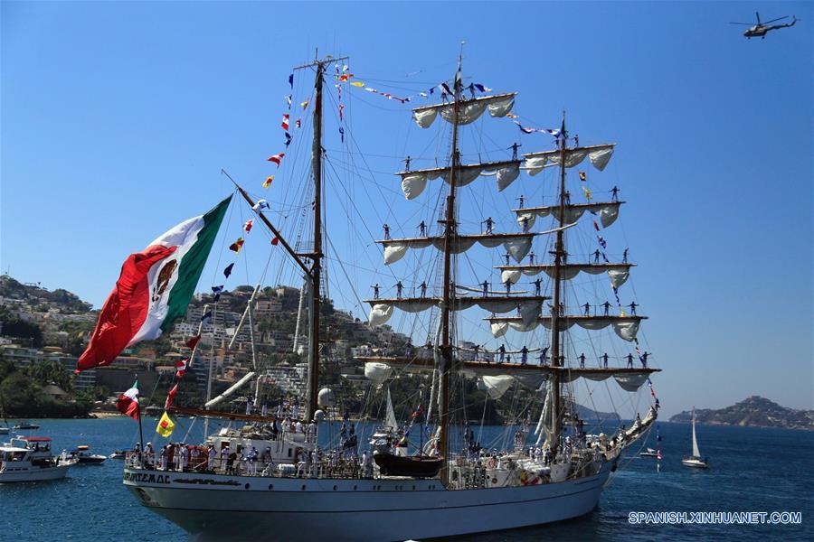GUERRERO, febrero 6, 2017 (Xinhua) -- El Buque Escuela Cuauhtémoc zarpa del puerto de Acapulco, en el estado de Guerrero, México, el 6 de febrero de 2017. El buque escuela Cuauhtémoc, un emblemático velero de la Marina-Armada de México, zarpó el lunes del balneario de Acapulco, en el sure?o estado de Guerrero, para recorrer 15 puertos del mundo, entre éstos, Shanghai, China. El buque comenzó en el puerto de Acapulco, en el Pacífico mexicano, un viaje de circunnavegación que lo llevará durante casi 10 meses por 12 países de América, Europa, Africa y Asia, informó la Secretaría de Marina-Armada de México. Los 234 tripulantes, entre mandos, instructores y cadetes, fueron despedidos con una ceremonia en cubierta presidida por el secretario de Marina, Vidal Francisco Soberón, y con la presencia de la primera dama, Angélica Rivera. (Xinhua/David Guzmán)