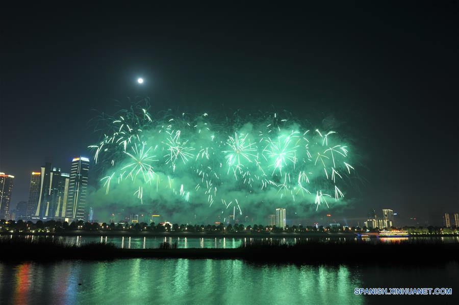 Fuegos artificiales explotan en el cielo para celebrar el Festival de las Linternas en Juzizhou, una isla en el Río Xiangjiang, en Changsha, capital de la provincia de Hunan, en China, el 11 de febrero de 2017. (Xinhua/Long Hongtao)
