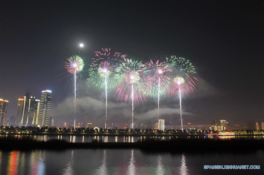 CHANGSHA, febrero 12, 2017 (Xinhua) -- Fuegos artificiales explotan en el cielo para celebrar el Festival de las Linternas en Juzizhou, una isla en el Río Xiangjiang, en Changsha, capital de la provincia de Hunan, en China, el 11 de febrero de 2017. (Xinhua/Long Hongtao)