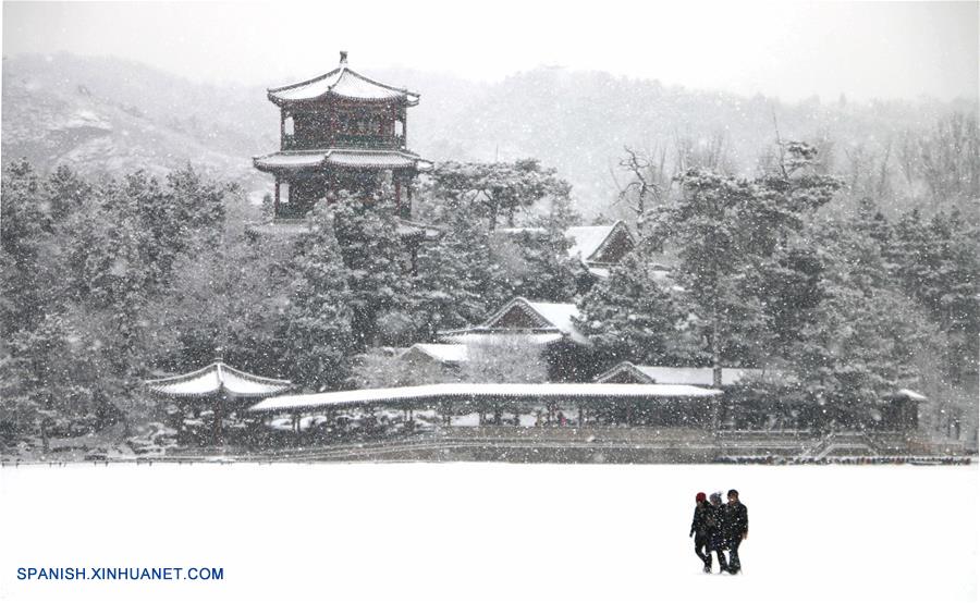 HEBEI, febrero 16, 2017 (Xinhua) -- Turistas observan el paisaje nevado en el complejo turístico de la Monta?a de Chengde, en Chengde, en la provincia de Hebei, en el norte de China, el 16 de febrero de 2017. Una nevada afectó la ciudad el jueves. (Xinhua/Liu Huanyu)