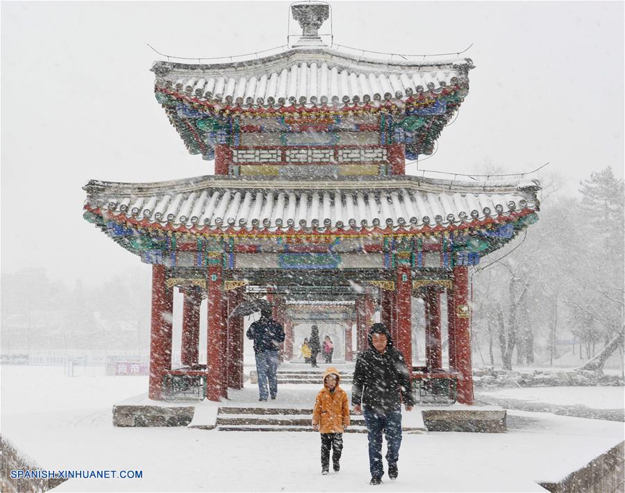 HEBEI, febrero 16, 2017 (Xinhua) -- Turistas observan el paisaje nevado en el complejo turístico de la Monta?a de Chengde, en Chengde, en la provincia de Hebei, en el norte de China, el 16 de febrero de 2017. Una nevada afectó la ciudad el jueves. (Xinhua/Xian Lidong)