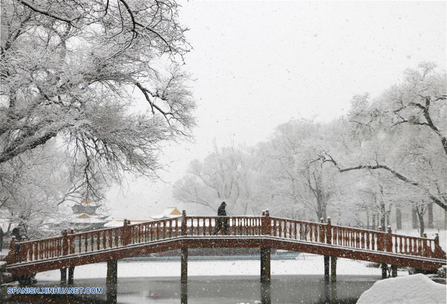 HEBEI, febrero 16, 2017 (Xinhua) -- Turistas caminan en un puente enmedio de la nieve en el complejo turístico de la Monta?a de Chengde, en Chengde, en la provincia de Hebei, en el norte de China, el 16 de febrero de 2017. Una nevada afectó la ciudad el jueves. (Xinhua/Liu Huanyu)