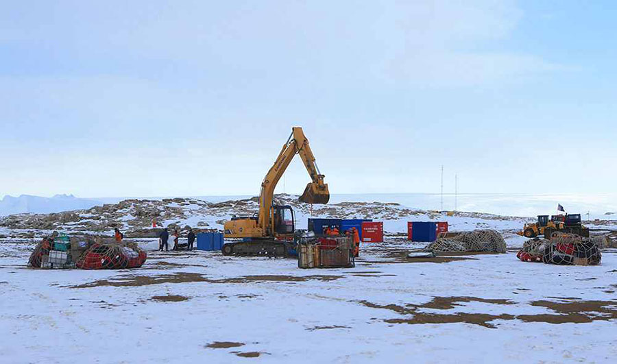 Los tanques de petróleo vacíos han sido almacenados, esperando ser transportados de vuelta a China continental a bordo del rompehielos Xuelong. [Foto: Xinhua]