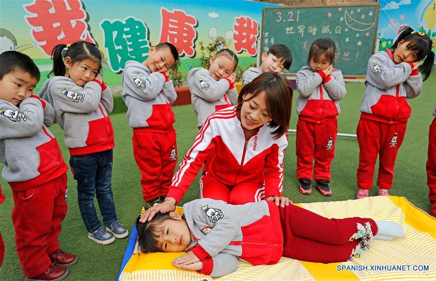 SHAANXI, marzo 21, 2017 (Xinhua) -- Una maestra ense?a la forma correcta de dormir para un ni?o en un jardín de ni?os en la ciudad de Weinan, provincia de Shaanxi, en el noroeste de China, el 21 de marzo de 2017. El martes se celebra el Día Mundial del Sue?o. (Xinhua/Cui Zhengbo)