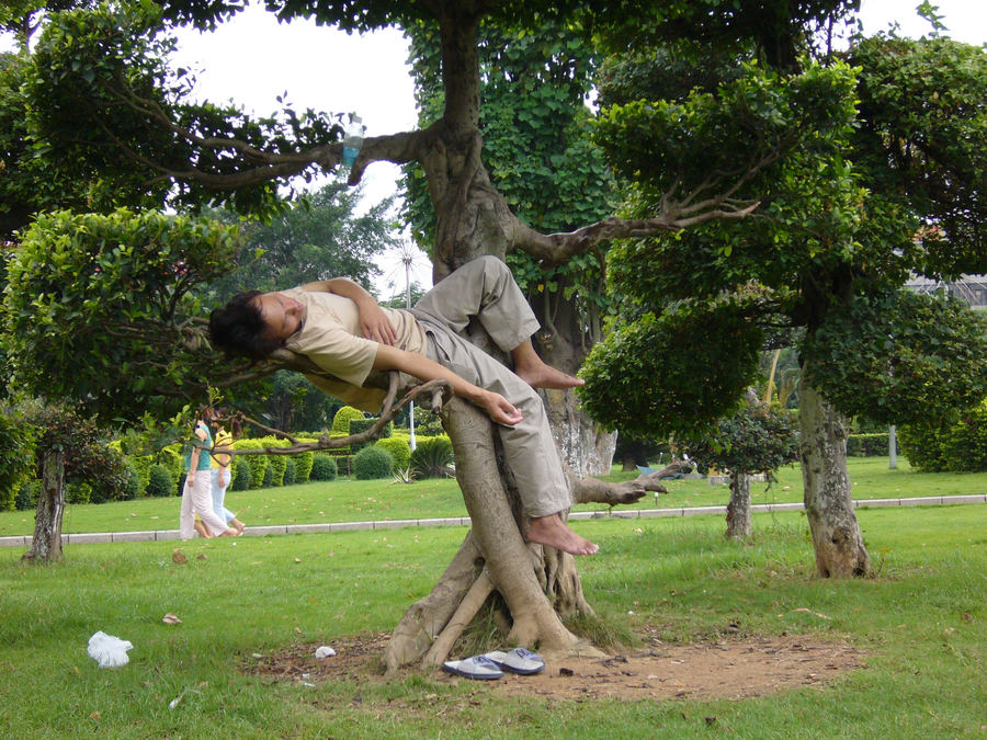 Un hombre duerme sobre la rama de un árbol en Shenzhen. [Foto/VCG]