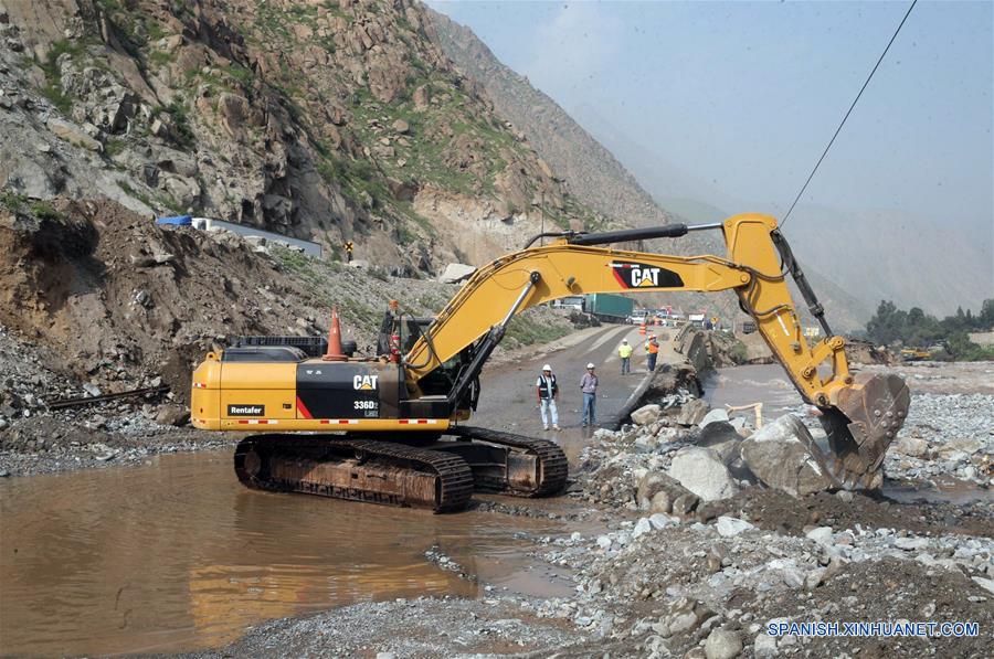 LIMA, marzo 26, 2017 (Xinhua) -- Empleados manejan una excavadora en la carretera central, afectada por el desborde del río Rimac, en la zona de Huarochirí, en Lima, Perú, el 26 de marzo de 2017. El Ni?o costero, que hasta el momento ha dejado al menos 90 muertos y unos 800,000 damnificados en Perú, mantenía el domingo sus afectaciones sobre la nación andina, y en la región de Piura descargaba una intensa lluvia por más de 15 horas. (Xinhua/Vidal Tarqui/ANDINA)