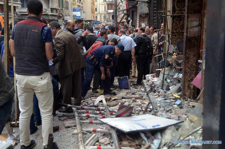 ALEJANDRIA, abril 9, 2017 (Xinhua) -- Personas permanecen en el sitio de una explosión en Alejandría, Egipto, el 9 de abril de 2017. Once personas murieron y 35 resultaron heridas en un ataque con bomba ocurrido cerca de una iglesia copta en la gobernación egipcia de Alejandría, informó el domingo el Ministerio de Salud de Egipto. (Xinhua/Str)