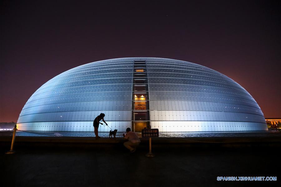 Personas descansan cerca del Centro Nacional de Artes Escénicas en Beijing, capital de China, el 11 de mayo de 2017. Algunos lugares de Beijing han sido iluminados para recibir al Foro de la Franja y la Ruta para la Cooperación Internacional, que se llevará cabo el 14 y 15 de mayo. (Xinhua/Shen Bohan)