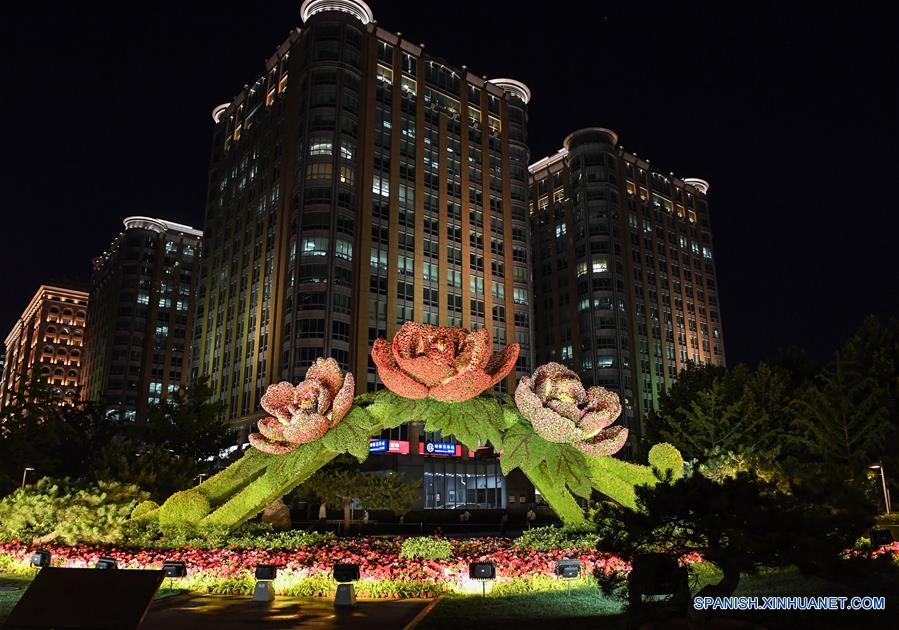 BEIJING, mayo 12, 2017 (Xinhua) -- Decoraciones de flores son iluminadas en el área de Dongdan, en el centro de Beijing, capital de China, el 11 de mayo de 2017. Algunos lugares de Beijing han sido iluminados para recibir al Foro de la Franja y la Ruta para la Cooperación Internacional, que se llevará cabo el 14 y 15 de mayo. (Xinhua/Li He)