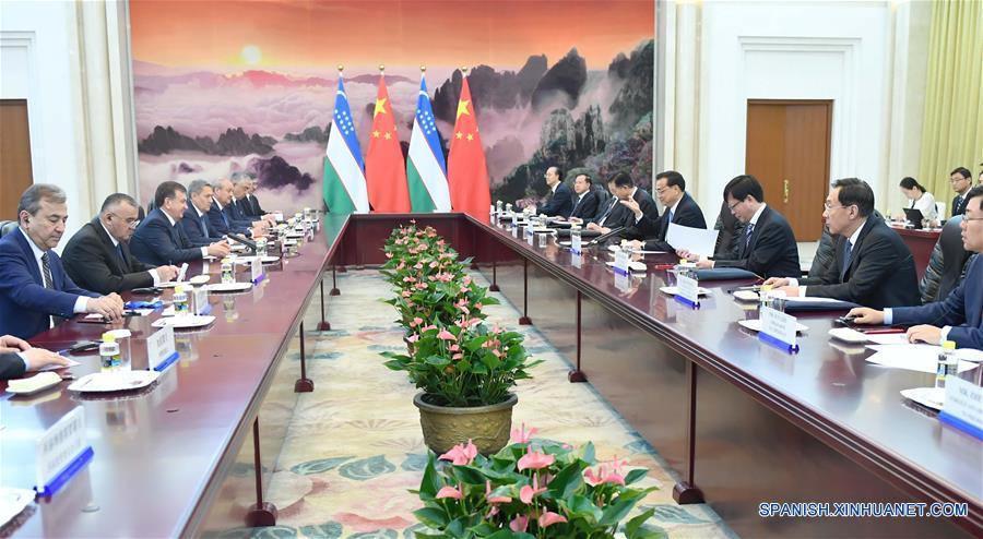 El primer ministro chino, Li Keqiang, se reúne con el presidente de Uzbekistán, Shavkat Mirziyoyev, quien está aquí para una visita de Estado y el próximo Foro de Cinturones y Caminos para la Cooperación Internacional, en el Gran Salón del Pueblo de Pekín, capital de China, 13 de mayo de 2017(Xinhua/Zhang Duo)