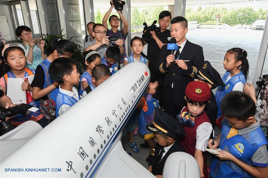BEIJING, junio 1, 2017 (Xinhua) -- Un piloto da una explicación sobre aviación a un grupo de ni?os, en la sede de la empresa Air China, en Beijing, capital de China, el 1 de junio de 2017. Un grupo de ni?os de entre 6 y 13 a?os visitó el jueves la sede de la aerolínea en el marco del Día Internacional del Ni?o. (Xinhua/Li He)