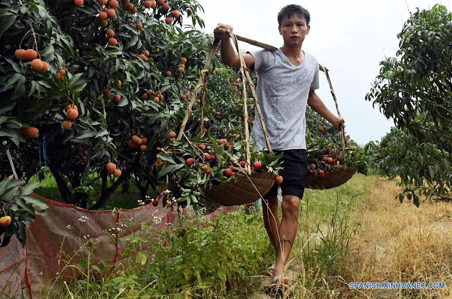 GUANGXI, junio 7, 2017 (Xinhua) -- Un residente transporta litchi (Litchi chinensis), en el condado de Linshan, en la Región Autónoma Zhuang de Guangxi, en el sur de China, el 7 de junio de 2017. Los agricultores en el lugar comenzaron a cosechar el litchi recientemente. (Xinhua/Zhang Ailin)