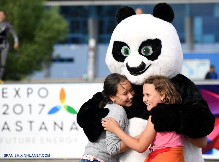 ASTANA, junio 6, 2017 (Xinhua) -- Ni?as juegan con un balarín vestido de panda durante una presentación del grupo de danza Sam Ruk de la Universidad Euroasiática, en Astaná, Kazajistán, el 5 de junio de 2017. (Xinhua/Wu Xiaoling)