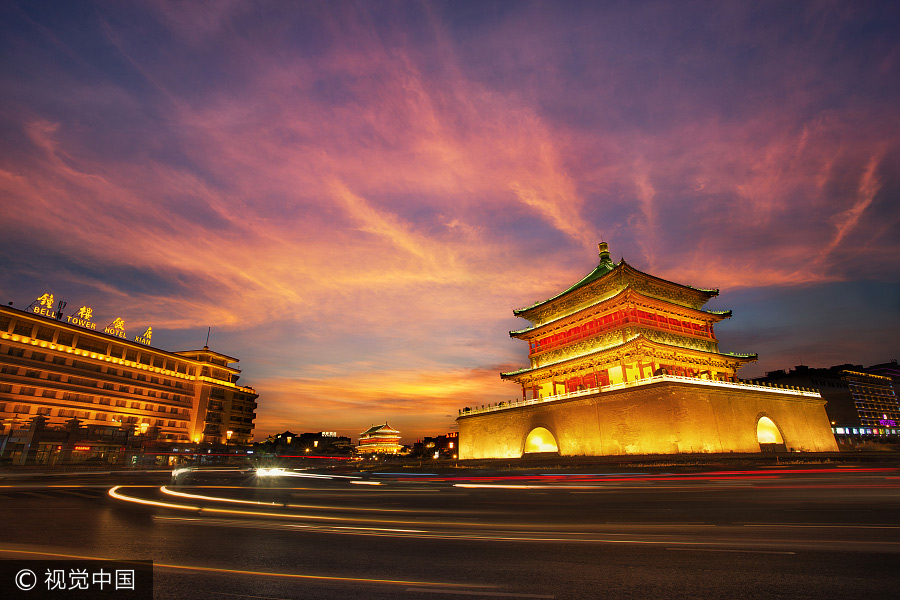 Vista nocturna de la Torre de la Campana en Xi'an, 21 de julio del 2014. [Foto: VCG]