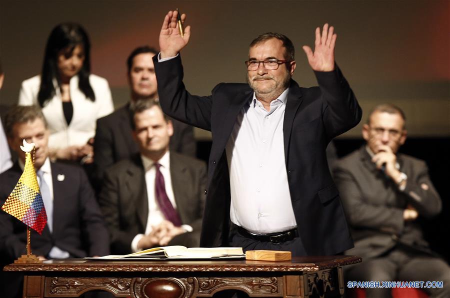 VILLAVICENCIO, julio 2, 2017 (Xinhua) -- Imagen de archivo del 24 de noviembre de 2016 del máximo líder de las Fuerzas Armadas Revolucionarias de Colombia (FARC), Rodrigo Londo?o, alias Timoleón Jiménez "Timochenko", reaccionando durante la ceremonia de firma del nuevo acuerdo de paz, entre el gobierno colombiano y las FARC, en el Teatro Colón, en Bogotá, capital de Colombia. De acuerdo con información de la prensa local, el máximo líder de las FARC, Rodrigo Londo?o, fue hospitalizado el domingo en Colombia a causa de problemas de salud. (Xinhua/Juan Páez/COLPRENSA)