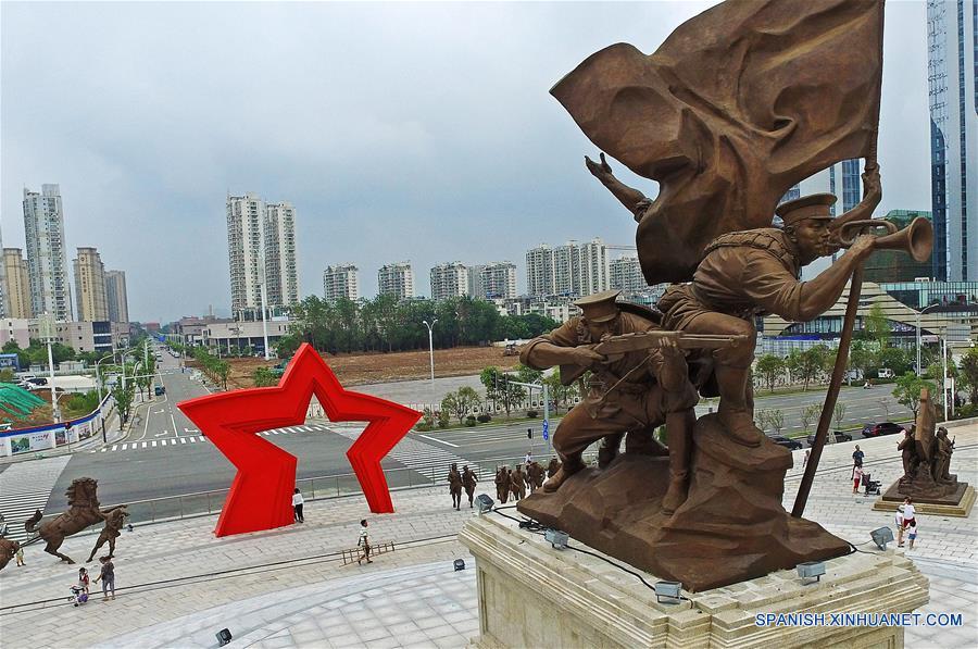 Vista de esculturas que conmemoran el 90 aniversario de la fundación del Ejército Popular de Liberación (EPL), en una plaza en Nanchang, en la provincia de Jiangxi, en el este de China, el 31 de julio de 2017. La plaza de las esculturas, cubrendo una zona de 16,000 metros cuadrados, fue abierta el lunes al público. (Xinhua/Wan Xiang)