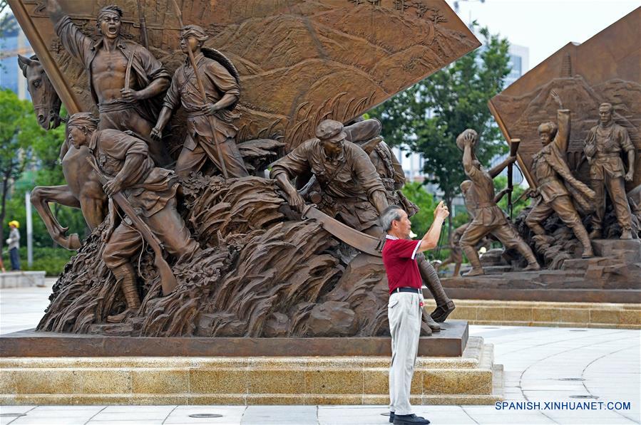Un visitante toma fotografías de esculturas que conmemoran el 90 aniversario de la fundación del Ejército Popular de Liberación (EPL), en una plaza en Nanchang, en la provincia de Jiangxi, en el este de China, el 31 de julio de 2017. La plaza de las esculturas, cubrendo una zona de 16,000 metros cuadrados, fue abierta el lunes al público. (Xinhua/Wan Xiang)