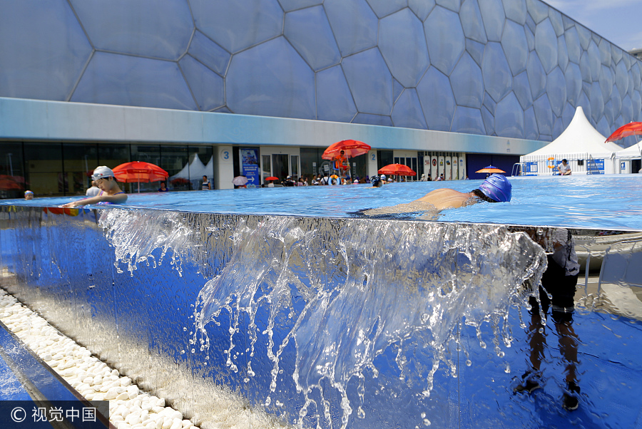 Un hombre nada en la piscina desmontable fuera del Cubo de Agua en Beijing, el 8 de agosto de 2017. [Foto / VCG]
