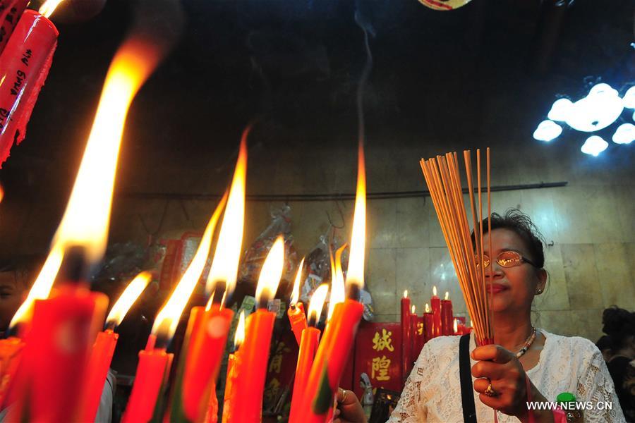 Una mujer reza delante de un santuario durante el Festival de los Fantasmas en un templo chino en Bangkok, Tailandia, el 5 de septiembre de 2017. El festival se celebra el décimo quinto día de julio según el calendario lunar (5 de septiembre en 2017) en muchos países asiáticos, día en el que la gente visita templos o participar en rituales para mostrar respeto a los difuntos. (Xinhua / Rachen Sageamsak)
