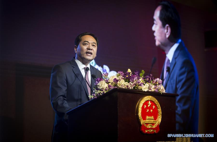 El embajador de China en Argentina, Yang Wanming, pronuncia un discurso durante una recepción para festejar el 68 aniversario de la fundación de la República Popular China, en Buenos Aires, Argentina, el 26 de septiembre de 2017. El embajador chino ante Argentina, Yang Wanming, afirmó el martes que la "nueva normalidad" del país asiático es una "gran oportunidad para profundizar y expandir la cooperación" entre Beijing y Buenos Aires. "Durante estos últimos cinco a?os, la integración de China con el mundo ha alcanzado un nuevo nivel. La parte china apuesta por construir nuevas relaciones internacionales, con foco en la cooperación de ganancia compartida", enfatizó el diplomático. Yang hizo estas declaraciones durante una recepción para festejar el 68 aniversario de la fundación de la República Popular China, acto al que asistieron, entre otros, el gobernador de la provincia de Jujuy, Gerardo Morales, el ministro de Ambiente y Desarrollo Sustentable, Sergio Bergman, y el diputado oficialista Eduardo Amadeo. (Xinhua/Martín Zabala)