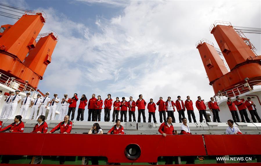 Los miembros del equipo chino de expedición científica saludan desde el rompehielos Xuelong. El rompehielos chino Xuelong (Dragón de la nieve) regresó a su base de Shanghai este martes, después de 83 días en el ártico, completando su octava expedición. 10 de octubre del 2017. (Foto: Fang Zhe)