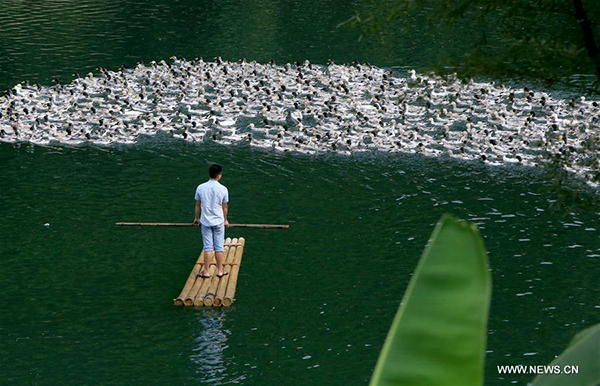 Un granjero cría patos en un estanque del pueblo Jiuxi, Rongshui, municipio autónomo Miao de Liuzhou, en la Región Autónoma de Guangxi Zhuang. En Rongshui se fundaron quince cooperativas para la cría de patos, actividad comercial que ya beneficia a más de 2,300 hogares de bajos ingresos. [Foto: Xinhua]