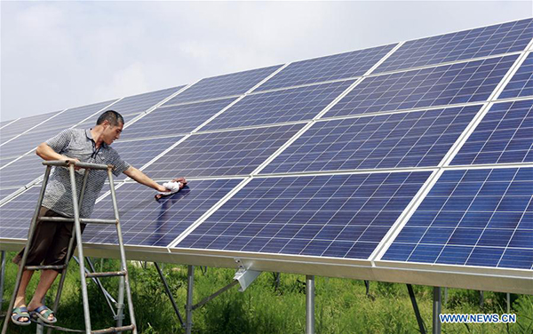 Un aldeano limpia un panel fotovoltaico en el pueblo Song, Fucheng, provincia de Hebei. El municipio Fucheng implementa proyectos PV de alivio de la pobreza para mejorar el nivel de vida de los aldeanos. Hasta la fecha, 4.774 hogares de bajos ingresos se han beneficiado del negocio de la generación de energía fotovoltaica. [Foto: Xinhua]