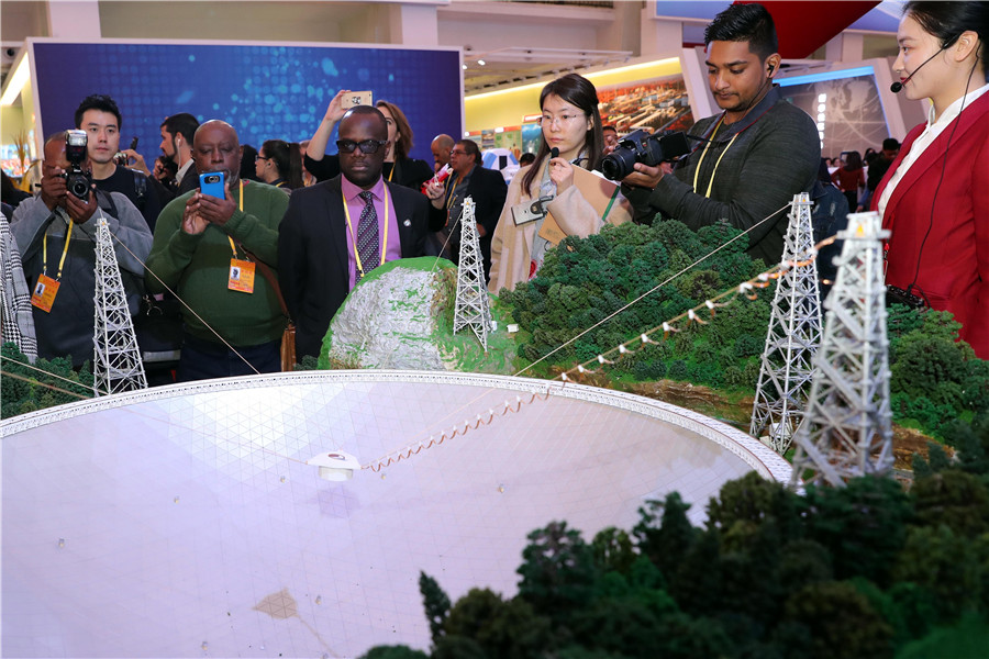 Durante una visita al Centro de Exposiciones de Beijing,los periodistas extranjeros observan una maqueta del Telescopio Esférico de Apertura de 500 metros (FAST, por sus siglas en inglés). Este radiotelescopio de plato es el más grande del mundo.La exhibición presenta los avances que China ha logrado durante los últimos cinco a?os. [Foto: Xinhua]