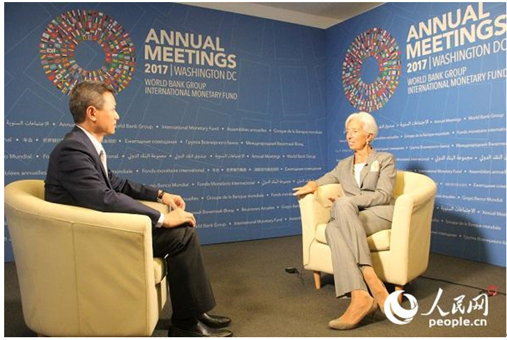 Imagen del 12 de octubre muestra al periodista de Diario del Pueblo entrevistando a la directora del Fondo Monetario Internacional, Christine Lagarde. Por Wu Lejun, Diario del Pueblo.