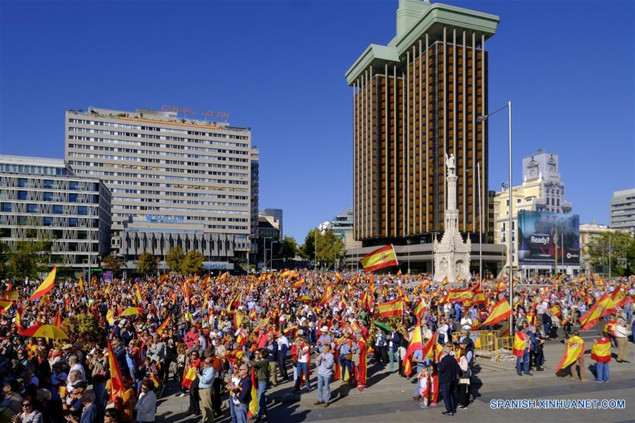 Personas participan durante una manifestación a favor de la unidad de Espa?a, en Madrid, Espa?a, el 28 de octubre de 2017. El gobierno espa?ol tomó el sábado oficialmente el control del gobierno regional de Catalu?a, la Generalitat, y el presidente del gobierno espa?ol, Mariano Rajoy, asumió el control de las funciones del presidente de la Generalitat. En Madrid, la capital espa?ola, miles de personas se reunieron en la Plaza Colón para defender la unidad del país y la Constitución de Espa?a. (Xinhua/Oscar González/NurPhoto/ZUMAPRESS)