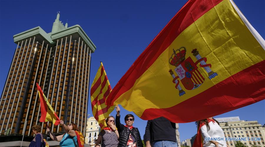 Personas participan durante una manifestación a favor de la unidad de Espa?a, en Madrid, Espa?a, el 28 de octubre de 2017. El gobierno espa?ol tomó el sábado oficialmente el control del gobierno regional de Catalu?a, la Generalitat, y el presidente del gobierno espa?ol, Mariano Rajoy, asumió el control de las funciones del presidente de la Generalitat. En Madrid, la capital espa?ola, miles de personas se reunieron en la Plaza Colón para defender la unidad del país y la Constitución de Espa?a. (Xinhua/Oscar González/NurPhoto/ZUMAPRESS)