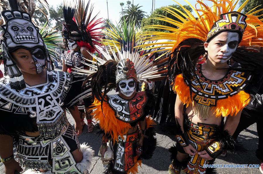 Personas participan durante la celebración del Día de Muertos, en el Cementerio Hollywood Forever en Los Angeles, Estados Unidos, el 28 de octubre de 2017. De acuerdo con información de la prensa local, la conmemoración de la tradición mexicana del Día de Muertos atrajo a muchos turistas el sábado. (Xinhua/Zhao Hanrong)
