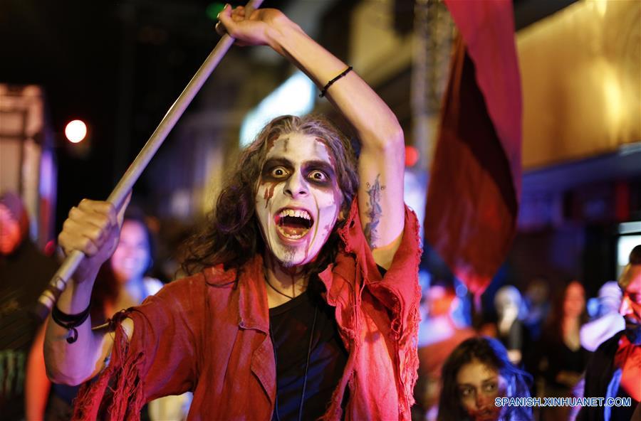 Una persona disfrazada posa durante la "Caminata Zombie" en San José, capital de Costa Rica, el 28 de octubre de 2017. De acuerdo con información de la prensa local, residentes portaron diversos disfraces para participar en la caminata zombie, evento organizado para celebrar Halloween. (Xinhua/Kent Gilbert)