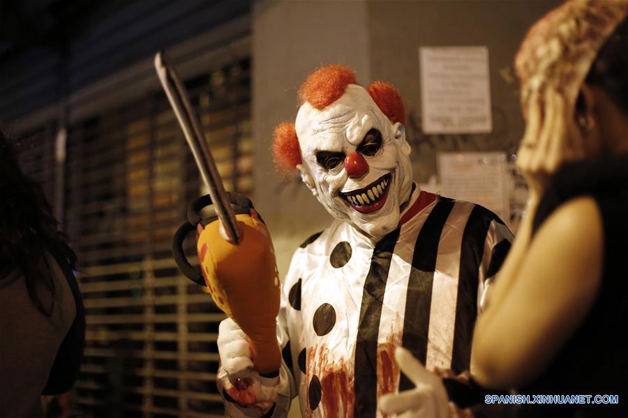 Una persona disfrazada posa durante la "Caminata Zombie" en San José, capital de Costa Rica, el 28 de octubre de 2017. De acuerdo con información de la prensa local, residentes portaron diversos disfraces para participar en la caminata zombie, evento organizado para celebrar Halloween. (Xinhua/Kent Gilbert)