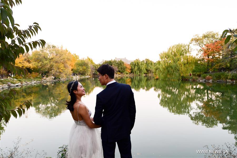 Una pareja se hace fotos de boda junto al lago de la Universidad de Pekín, capital de China, el 29 de octubre de 2017. (Xinhua / Chen Yehua)