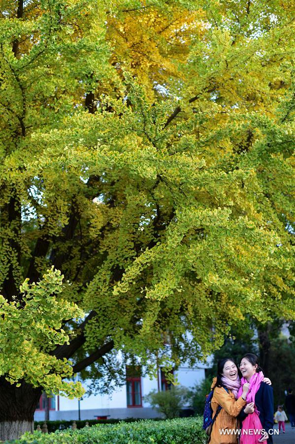 Dos chicas se hacen fotos bajo un árbol de ginkgo en la Universidad de Pekín, capital de China, el 29 de octubre de 2017. (Xinhua / Chen Yehua)