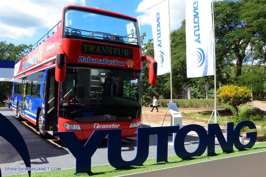 Imagen del 30 de octubre de 2017, de un autobús de Yutong exhibido durante la inauguración de la 35 Feria Internacional de la Habana (FIHAV) 2017, en el recinto ferial Expocuba, en La Habana, Cuba. (Xinhua/Joaquín Hernández)