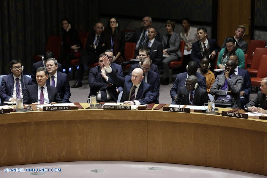 El embajador de Rusia ante la Organización de las Naciones Unidas (ONU), Vassily Nebenzia (c-frente), vota en contra de una resolución elaborada por Estados Unidos para renovar el mandato del mecanismo que investiga los ataques químicos en Siria, en la sede de la ONU, en Nueva York, Estados Unidos, el 16 de noviembre de 2017. (Xinhua/Li Muzi)