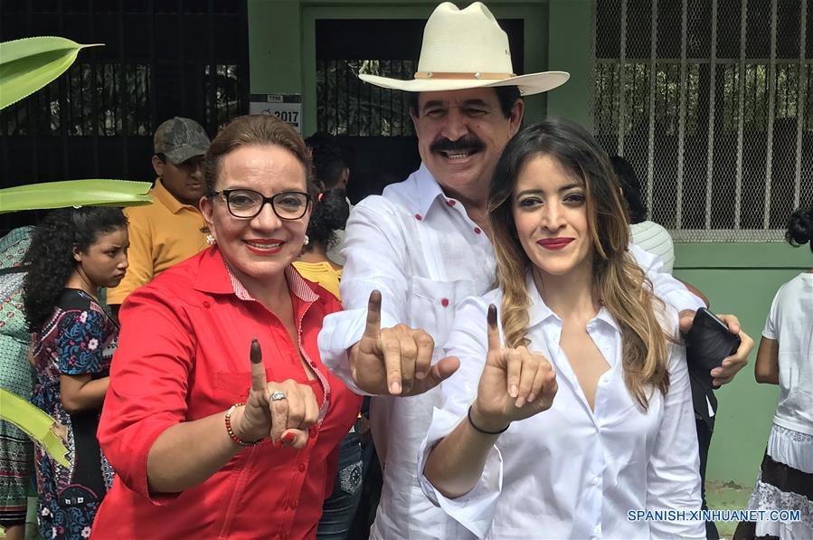 CATACAMAS, noviembre 26, 2017 (Xinhua) -- Imagen tomada con un dispositivo móvil del ex presidente de Honduras y coordinador de la Alianza conformada por el partido Libertad y Refundación (Libre) y el Partido Innovación y Unidad (PINU), Manuel Zelaya (c-frente), acompa?ado de su esposa Xiomara Castro (i-frente) y de su hija Xiomara Zelaya (d-frente), después de emitir su voto en la ciudad de Catacamas, Olancho, Honduras, el 26 de noviembre de 2017. Las urnas fueron cerradas en Honduras después de una jornada en la cual los hondure?os acudieron para elegir un nuevo presidente. Los 5.687 centros de votación que se instalaron en todo el país y en seis ciudades de los Estados Unidos cerraron a las 16:00 hora local (22:00 GMT). Los comicios han transcurridos con normalidad y sin incidentes, bajo la supervisión de más de 700 observadores internacionales y 1.600 nacionales. (Xinhua/Str)