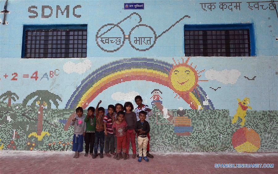 NUEVA DELHI, noviembre 28, 2017 (Xinhua) -- Ni?os posan frente a sanitarios dise?ados para ni?os, en Nueva Delhi, India, el 28 de noviembre de 2017. (Xinhua/Zhang Naijie)