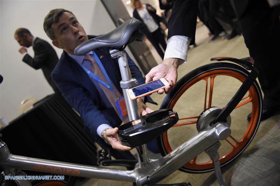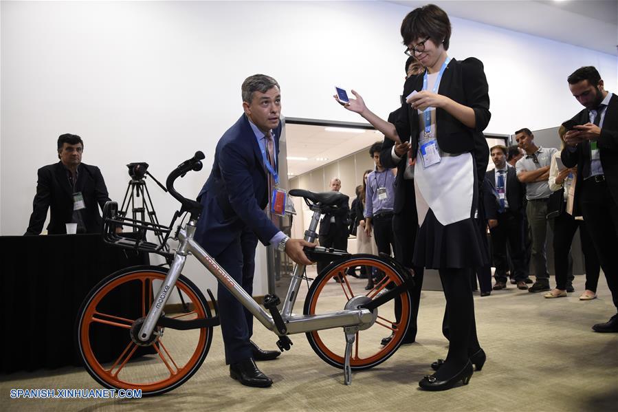 PUNTA DEL ESTE, diciembre 1, 2017 (Xinhua) -- Un representante de la compa?ía china de bicicletas compartidas Mobike, presenta una unidad a los representantes de los medios de comunicación durante la XI Cumbre Empresarial China-LAC (Latinoamérica y Caribe) 2017, en el Centro de Convenciones de Punta del Este, Uruguay, el 1 de diciembre de 2017. Mobike, una de las principales empresas de bicicletas de uso compartido de China, está presente en la XI Cumbre Empresarial China-LAC (Latinoamérica y Caribe) 2017. Mobike comenzó a funcionar en Shanghai en abril de 2016, antes de expandirse en las principales ciudades chinas e irrumpir en el exterior. En Punta del Este, decenas de los asistentes al evento se turnaron para conocer las bondades del producto, tomar fotos y, con una sonrisa, pasear en bicicleta por el lugar. (Xinhua/Nicolás Celaya)