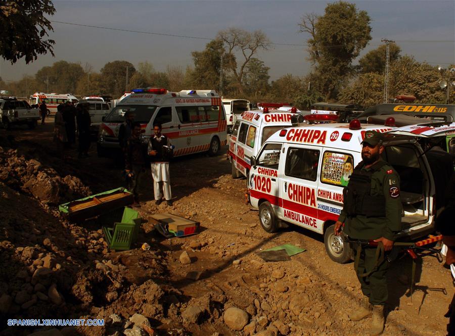 Ambulancias permanecen frente a la Universidad de Agricultura de Peshawar luego de un ataque en Peshawar, Pakistán, el 1 de diciembre de 2017. Al menos nueve personas murieron y 35 resultaron heridas la ma?ana del viernes cuando cuatro terroristas asaltaron un albergue estudiantil ubicado en la ciudad pakistaní de Peshawar, informó el medio local en idioma urdu, ARY. (Xinhua/Muhammad Hadi)